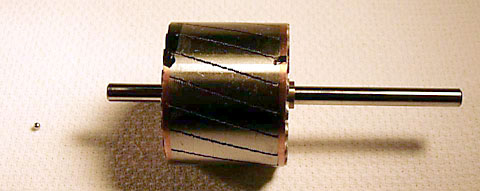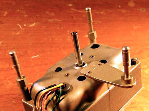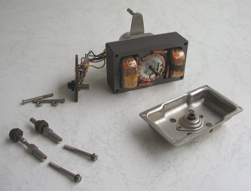 Der im Bild sichtbare Deckel des Motor kann nach Lösen von vier Schrauben abgenommen werden, man sieht dann den Trommelanker des Induktionsmotors. Die Achse des Ankers kann dann leicht gesäubert werden, ebenso sollte die im Motordeckel befindliche Lagerbuchse, in der die Ankerachse läuft, gereinigt werden, denn dort sitzt meist das verharzte Altöl. Man kann den Anker natürlich auch komplett aus dem Motorgehäuse herausnehmen, muss dazu allerdings vorher den Antriebspulley, der mit zwei Schräubchen gesichert ist, entfernen.