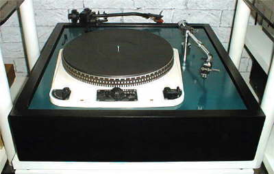 Aus einfachem MDF habe ich mir eine solche Zarge gebaut (noch ohne Bodenplatte) und einen TD 124 Mk. II eingebaut, hier zu sehen mit einem Tonarm von Audio-Technica.