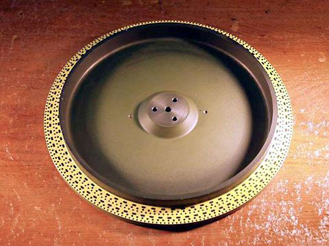 Jetzt steht einem ersten Funktionstest nichts mehr im Wege - den Stecker in die Steckdose und einfach mal auf 33 schalten. Im Normalfall genügt es meiner Meinung nach, wenn der (nicht vom Profi revidierte) Motor innerhalb weniger Minuten seine Soll-Drehzahl erreicht und diese auch hält (leicht mittels des Stroboskops zu überprüfen). [Unter Profis gilt das Erreichen einer stabilen Soll-Drehzahl innerhalb weniger SEKUNDEN als erstrebenswert - für uns "Normalos" (ohne weitergehende Erfahrungen in Wartung von Motoren und Lagern, zu dieser Gruppe zähle ich mich auch selbst) genügen "etwas kleiner gebackene Brötchen" aber durchaus. Auch wenn es drei oder vier Minuten dauert, bis die Soll-Drehzahl "steht" - wichtig ist, DASS sie steht und nicht schwankt.] Wenn er etwas zu schnell oder zu langsam läuft, kann man erstmal mit Hilfe der Drehzahlfeineinstellung versuchen, regulierend einzugreifen - vielleicht ist nur eine geringe Korrektur erforderlich. Mann kann auch etwas mit dem Abstand des halbmondförmigen Magneten zum Stufenrad experimentieren - je näher der Magnet kommt, desto größer wird die Bremswirkung und umgekehrt.