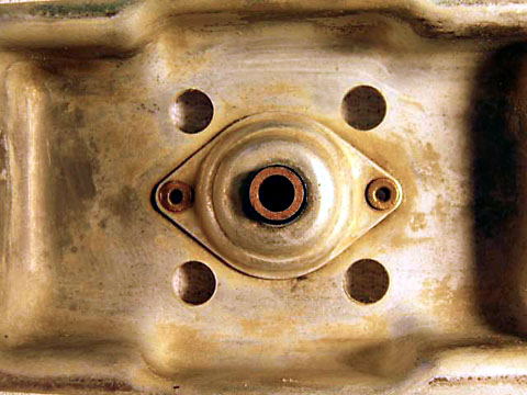 Wenn der Lagerschaft vorsichtig herausgezogen wurde, sollte man diesen und das Innere der Lagerbuchse sorgfältig von den Resten des alten Öls befreien. Zur Zeit benutze ich noch ein Öl, welches die Firma Faller für die Motoren ihrer Modellflugzeuge und -boote anbietet, und beträufele sowohl die Wand der Buchse als auch die Oberfläche des Schaftes (und die Kugel an seinem unteren Ende) ausreichend mit Öl, dann setze ich den Schaft wieder ein. Es dauert einige Zeit, bis er sich gesetzt hat, schließlich sind die Teile mit sehr geringen Toleranzen gefertigt - also etwas Geduld bitte. NICHT gewaltsam runterdrücken !