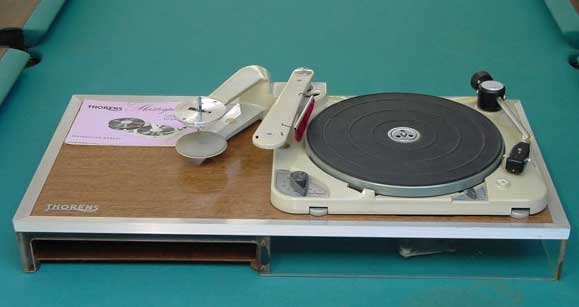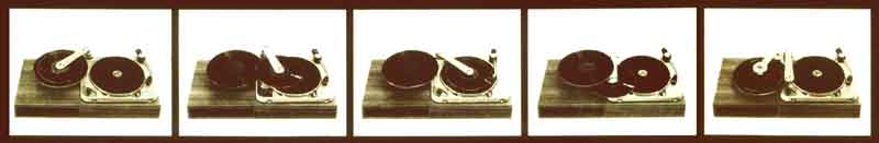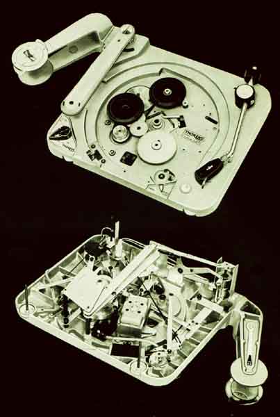 Die Komplexität der Konstruktion sieht man auf dem unteren Bild. Das System aus Hebeln, Federn und anderen mechanischen Übertragungsteilen wurde aktiviert, sobald die Platte abgespielt und der Tonarm zurückgeführt war. Die Platte wurde vom Wechselarm aufgenommen und abgelegt. Eine neue Platte wurde vom Stapel genommen und auf den Plattenteller gelegt. Der Tonarm bewegte sich automatisch über die Einlaufrille, senkte sich ab und die Musik begann von neuem. Bis zu acht Schallplatten mit unterschiedlichen Durchmessern konnten so nacheinander abgespielt werden. Da der horizontale Abtastwinkel immer gleich war - es lag ja immer nur eine Platte auf dem Teller - gab es keine Klangeinbußen aufgrund von Winkelfehlern. Dieser große Nachteil der damals gängigen Plattenwechsler trat beim TD 224 also nicht auf.