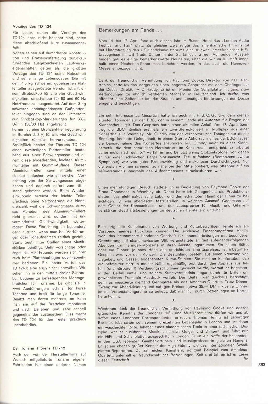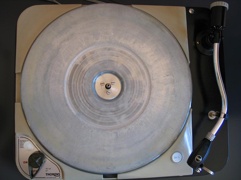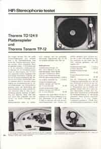 TD 124 bzw. TD 124/II (ab 1966) - schwere Laufwerke für den Rundfunk und den „ambitionierten Musikliebhaber“, der Beginn der Legende. Vorgestellt 1957. Thorens begegnete dem Problem vieler zeitgenössischer Reibradler – Motorvibrationen konnten vom Reibrad direkt auf den Plattenteller übertragen werden – , indem der (zudem mit nur 10 Watt relativ schwache, aber dennoch mehr aus ausreichend dimensionierte) Motor über einen zusätzlichen Riemenantrieb vom Reibrad entkoppelt wurde. Die störenden Vibrationen konnten so sehr stark abgemildert werden. Der Plattenteller besteht aus zwei Teilen: der schwere Subteller aus Gusseisen (4,5kg, magnetisch – später gab es als Sonderausstattung einen 1,5kg leichteren Teller aus nicht-magnetischem Zink-Spritzguss) wirkt wie ein Schwungrad (engl. Flywheel), während der eigentliche Plattenteller mit der aufgelegten Gummimatte aus Aluminium (Gewicht 500 g) besteht. Über eine Kupplung konnte dieser Plattenteller leicht angehoben und so vom Subteller getrennt gestoppt werden, während Motor und Subteller weiterliefen. Durch dieses System konnte in der Praxis einerseits der Verschleiß des Reibrades erheblich reduziert und andererseits eine extrem kurze Start- und Stoppzeit (< 1 s) ermöglicht werden; die Hochlaufzeit des gesamten Antriebsystems dauerte ebenfalls nur wenige Sekunden. Technik : Vierpoliger Induktionsmotor E50, Übertragungsmechanismus mittels Gummi-Treibriemen von der Motorachse (umsteckbarer Pulley mit Durchmessern für 50Hz- oder 60Hz-Betrieb, mit 2 Madenschrauben gesichert) auf das unabhängig gelagerte Stufenrad (mit Wirbelstrombremse), von dort über ein 80 mm durchmessendes Gummi-Reibrad auf den inneren Rand des Plattentellers (= kombinierter Riemen/Reibrad-Antrieb). Geschwindigkeiten 16, 33, 45 und 78 U/Min. Ausgerüstet mit einem Stroboskop sowie einer Drehzahlfeineinstellung (+/- 3%, durch patentierte Magnetbremse). 1977 war dann der Lagervorrat an E50-Ersatzmotoren erschöpft und die Firma Papst entwickelte speziell für den 124er einen sogenannten "Außenläufer-Motor", der den Vorteil einer großen Schwungmasse nutzte. Mit diesem Motor konnten außerdem die Rumpelstörungen um fast die Hälfte reduziert werden. Da mit diesem Motor aber der im Gerät eingebaute Spannungswähler nicht mehr genutzt werden durfte, wurden zwei Varianten angeboten (3805-200 für 200-240 Volt/50 Hz, 3806-110 für 100-125 Volt/60 Hz). Eingebauter Single-Puck, versenkt, außerdem ist eine Libelle in das Chassis aus Aluminiumguss eingelassen. Entkopplung des Motors vom Chassis (3-Punkt-Aufhängung, je ein Gummidämpfer), Entkopplung des Chassis von der Zarge durch vier Gummipuffer („Pilze“). Wechselbare Armbretter, für 9- und 12-Zoll-Arme geeignet. Wurde mit verschiedenen Zargen und mit verschiedenen Armen ausgerüstet und außerdem als Einbaulaufwerk verkauft. Primäre Unterscheidungsmerkmale TD 124 zu TD 124/II (ab 1966) : TD 124 cremefarben, TD 124/II grau. Die Gummimatte auf dem Aluteller hat beim TD 124 viele durchgehende Ringe, beim TD 124/II deutlich weniger und zudem durchbrochene Ringe. Die Bedienfelder (links vorne) sind unterschiedlich gestaltet (auf den Bildern zu erkennen). Der entwicklungstechnisch wichtigste Unterschied war jedoch die modifizierte Motoraufhängung mit nun sechs (3x2) statt bisher drei (3x1) Gummidämpfern. Preise 1963 : Laufwerk TD 124 395 SFr, mit Tonarm BTD-12S und Shure-Diamant-System 629 SFr. Preise 1968 : Laufwerk TD 124/II 515 DM, mit Tonarm TP-14 725 DM, mit TP-14 und Tonabnehmer Stanton 581 (MM) 990 DM, mit TP-14 und Tonabnehmer Ortofon S 15 T (MC) 1020 DM. Der TP-14 kostete mit “Aufsetzhilfe” (=Lift) und Montageplatte PLN-14 212 DM (1968). Für SME 3009/PLN-09 bzw. 3012/PLN-12 wurden ebenfalls 1968 383 bzw. 404 DM verlangt.