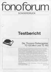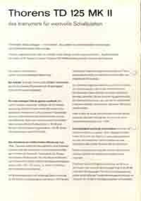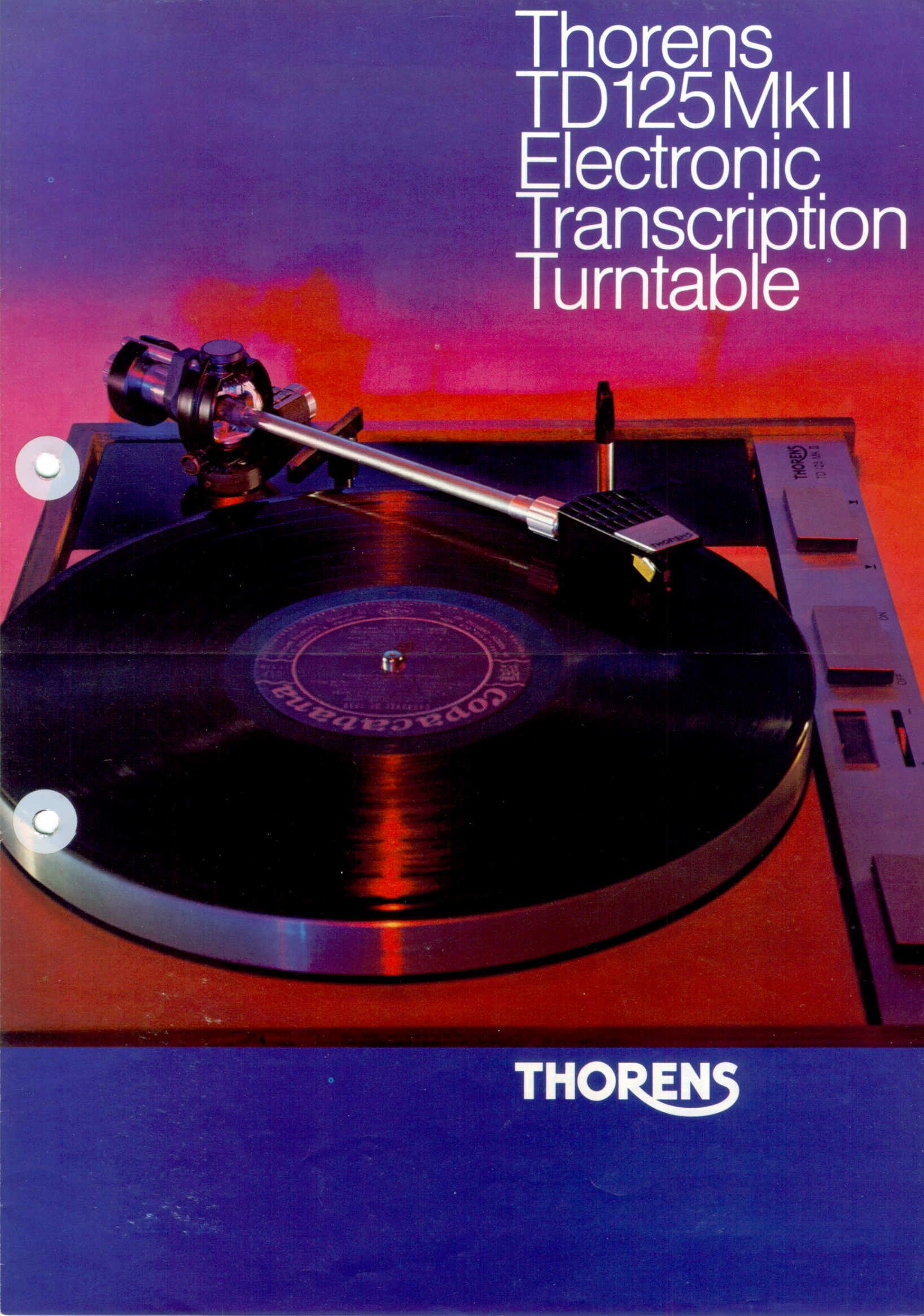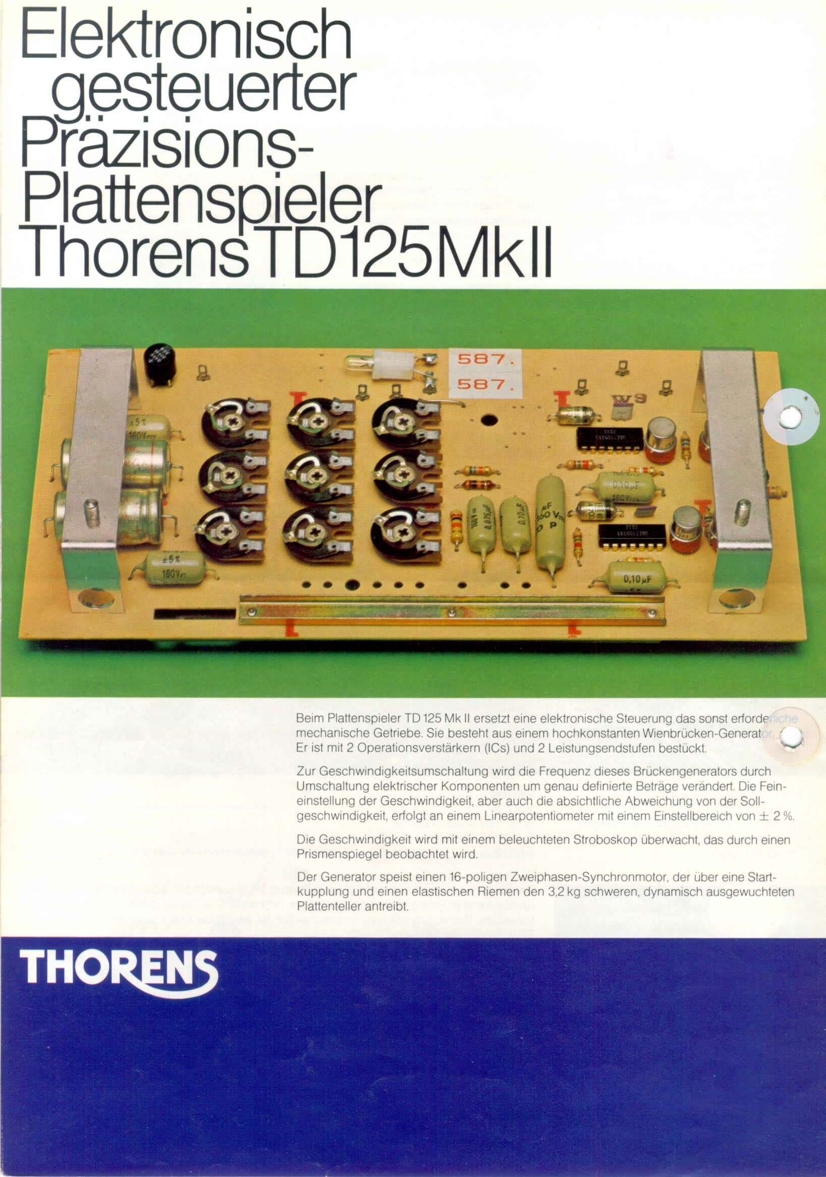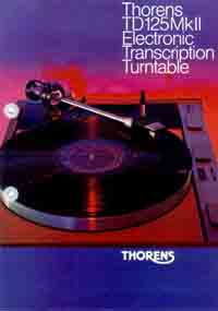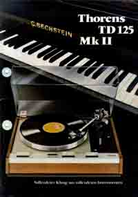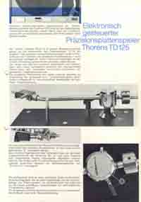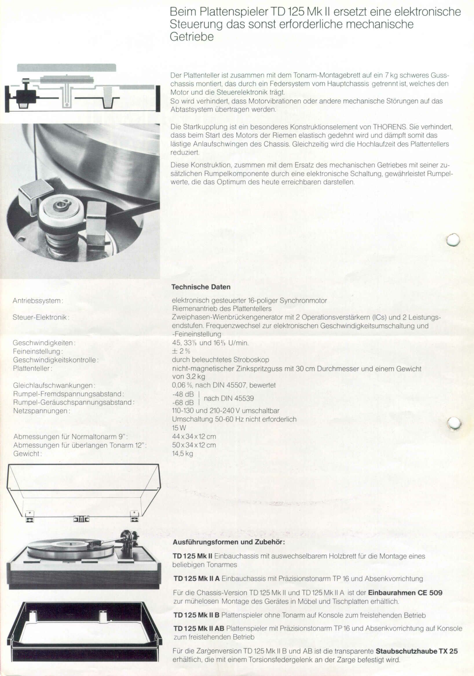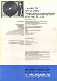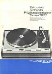 TD 125 bzw. TD 125 Mk. II (ab 1972) - im Jahr 1968 als legitimer Nachfolger des TD 124 auf den Markt gekommen. Konstruktiv hatte der 125er mit seinem Vorgänger so gut wie nichts mehr gemeinsam. Man orientierte sich an der neuen Technik mit einstufigem Riemenantrieb und Subchassis, die sich bereits seit 1965 in dem kompakten TD 150 bewährt hatte. Der wesentlich massivere Aufbau ließ jedoch keine Zweifel an der Tatsache aufkommen, dass der TD 125 in die Fußstapfen des berühmten Vorgängers treten sollte. Die Nachbarschaft zum professionellen Rundfunkausrüster EMT, mit dem Thorens seit 1966 eng zusammenarbeitete, mag ebenfalls für die studiotaugliche Auslegung des TD 125 ausschlaggebend gewesen sein, die enge Zusammenarbeit beider Firmen wurde bei dem 1971 vorgestellten EMT 928 deutlich sichtbar. Neben der für 9"-Tonarme ausgelegten Basisversion (TD 125 AB) war das Laufwerk auch mit einer großen Zarge aus Walnussholz erhältlich, auf der sogar 16"-Studiotonarme montiert werden konnten (TD 125 LB). Außerdem war für den Direkteinbau eine Variante ohne Zarge lieferbar, die bei der Installation in einen Montagerahmen (CE 509) eingesetzt werden musste.