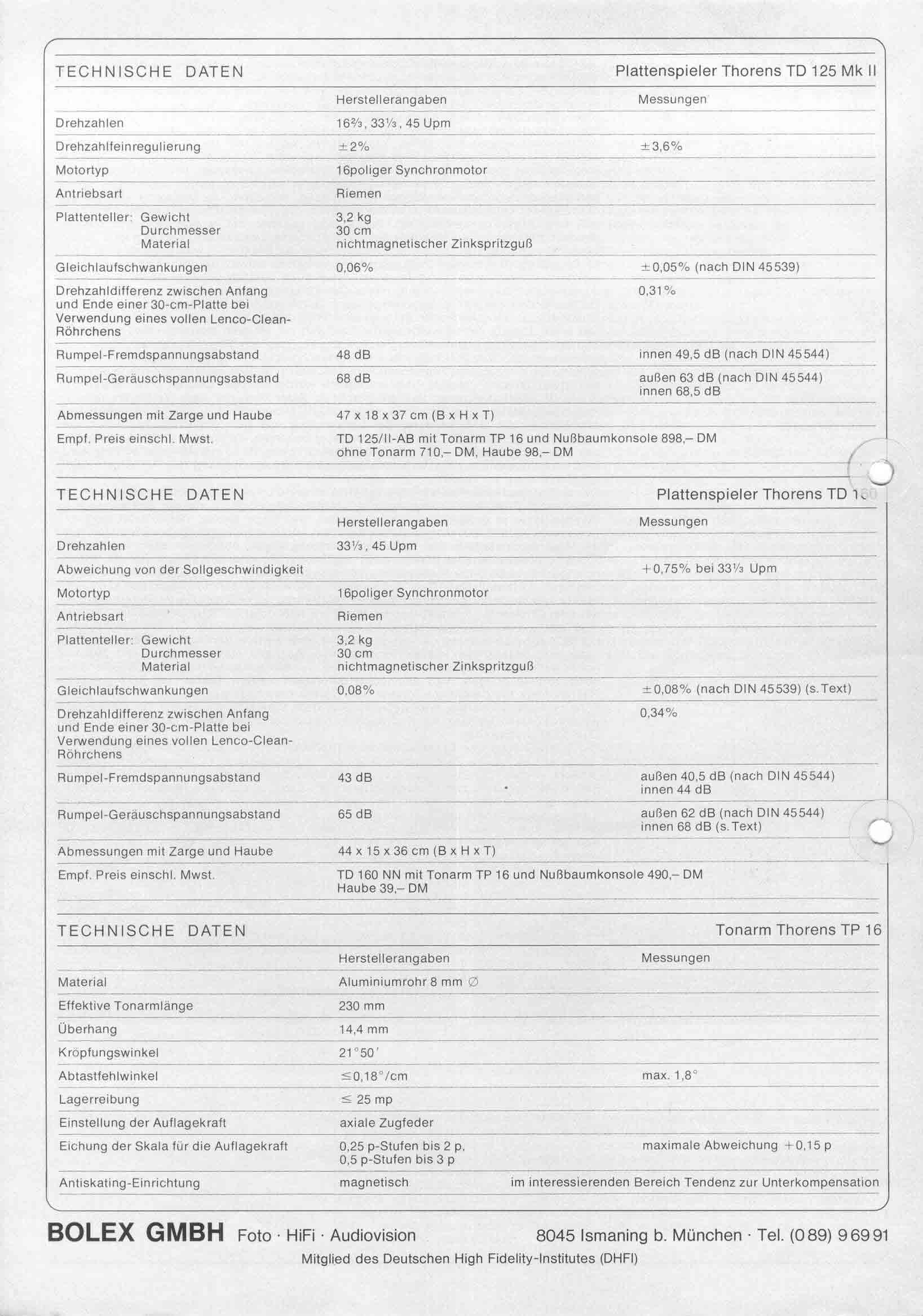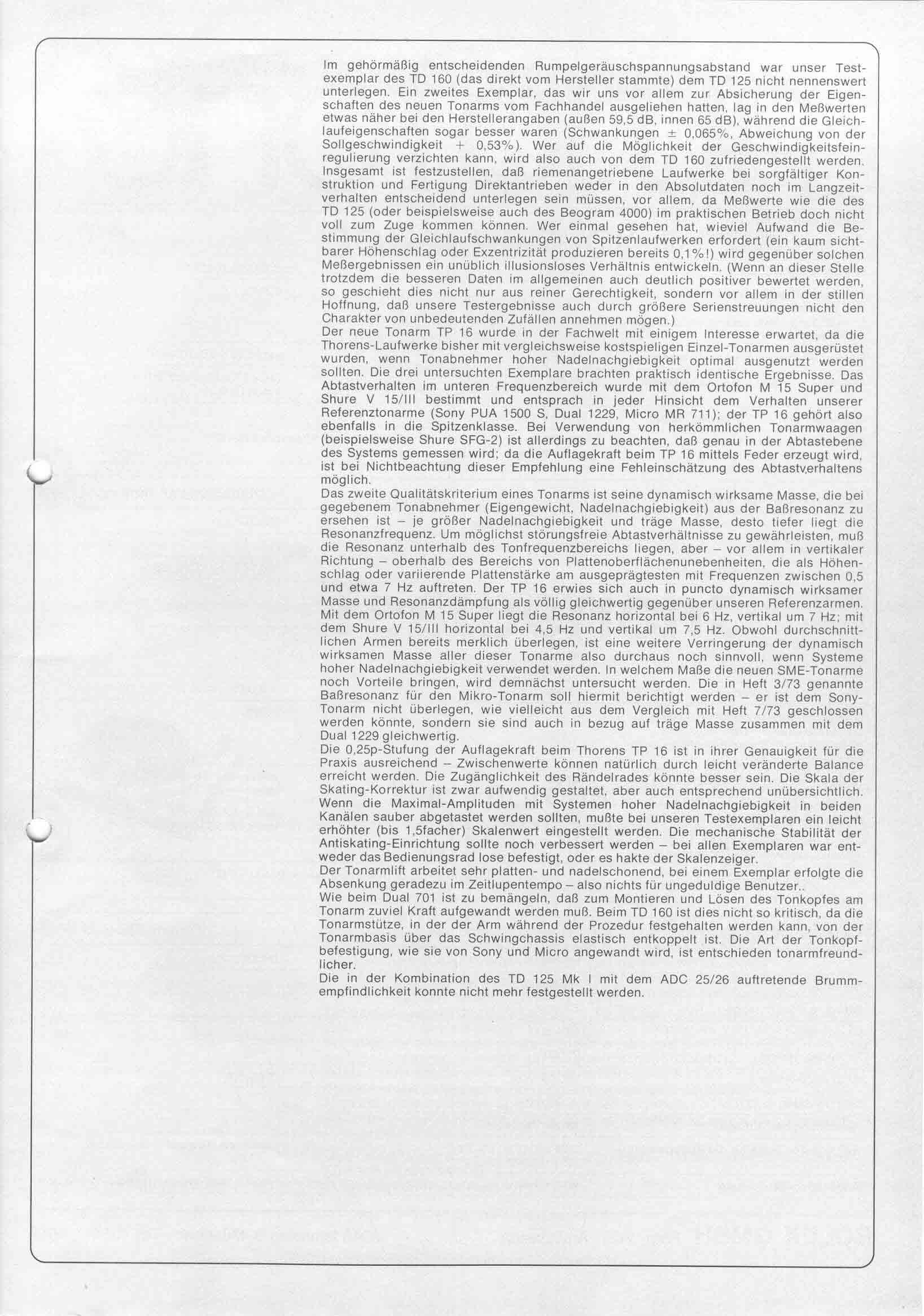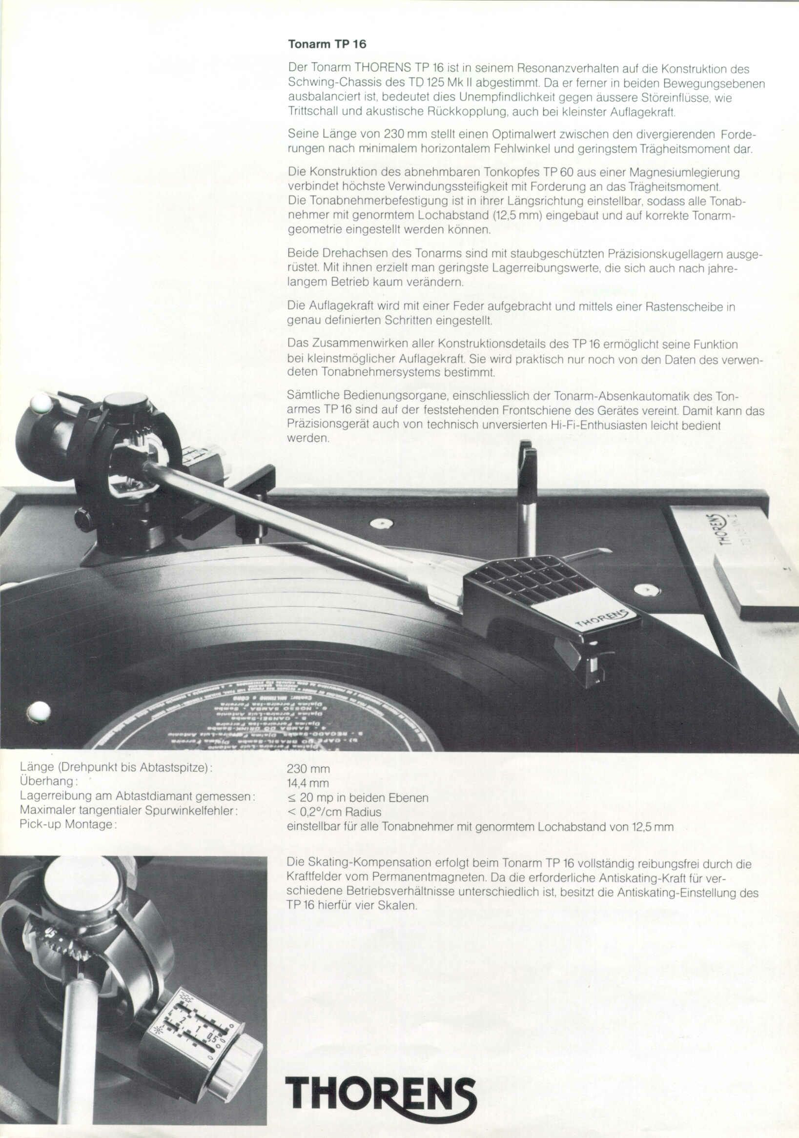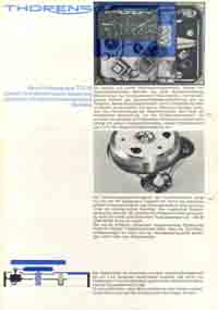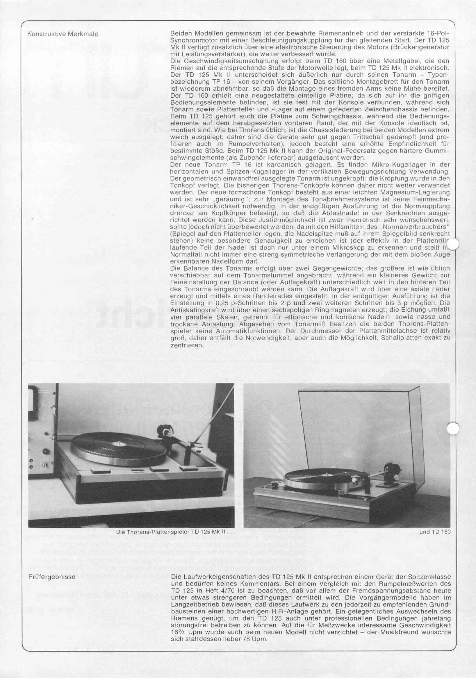 TD 125 bzw. TD 125 Mk. II (ab 1972) - im Jahr 1968 als legitimer Nachfolger des TD 124 auf den Markt gekommen. Konstruktiv hatte der 125er mit seinem Vorgänger so gut wie nichts mehr gemeinsam. Man orientierte sich an der neuen Technik mit einstufigem Riemenantrieb und Subchassis, die sich bereits seit 1965 in dem kompakten TD 150 bewährt hatte. Der wesentlich massivere Aufbau ließ jedoch keine Zweifel an der Tatsache aufkommen, dass der TD 125 in die Fußstapfen des berühmten Vorgängers treten sollte. Die Nachbarschaft zum professionellen Rundfunkausrüster EMT, mit dem Thorens seit 1966 eng zusammenarbeitete, mag ebenfalls für die studiotaugliche Auslegung des TD 125 ausschlaggebend gewesen sein, die enge Zusammenarbeit beider Firmen wurde bei dem 1971 vorgestellten EMT 928 deutlich sichtbar. Neben der für 9"-Tonarme ausgelegten Basisversion (TD 125 AB) war das Laufwerk auch mit einer großen Zarge aus Walnussholz erhältlich, auf der sogar 16"-Studiotonarme montiert werden konnten (TD 125 LB). Außerdem war für den Direkteinbau eine Variante ohne Zarge lieferbar, die bei der Installation in einen Montagerahmen (CE 509) eingesetzt werden musste.