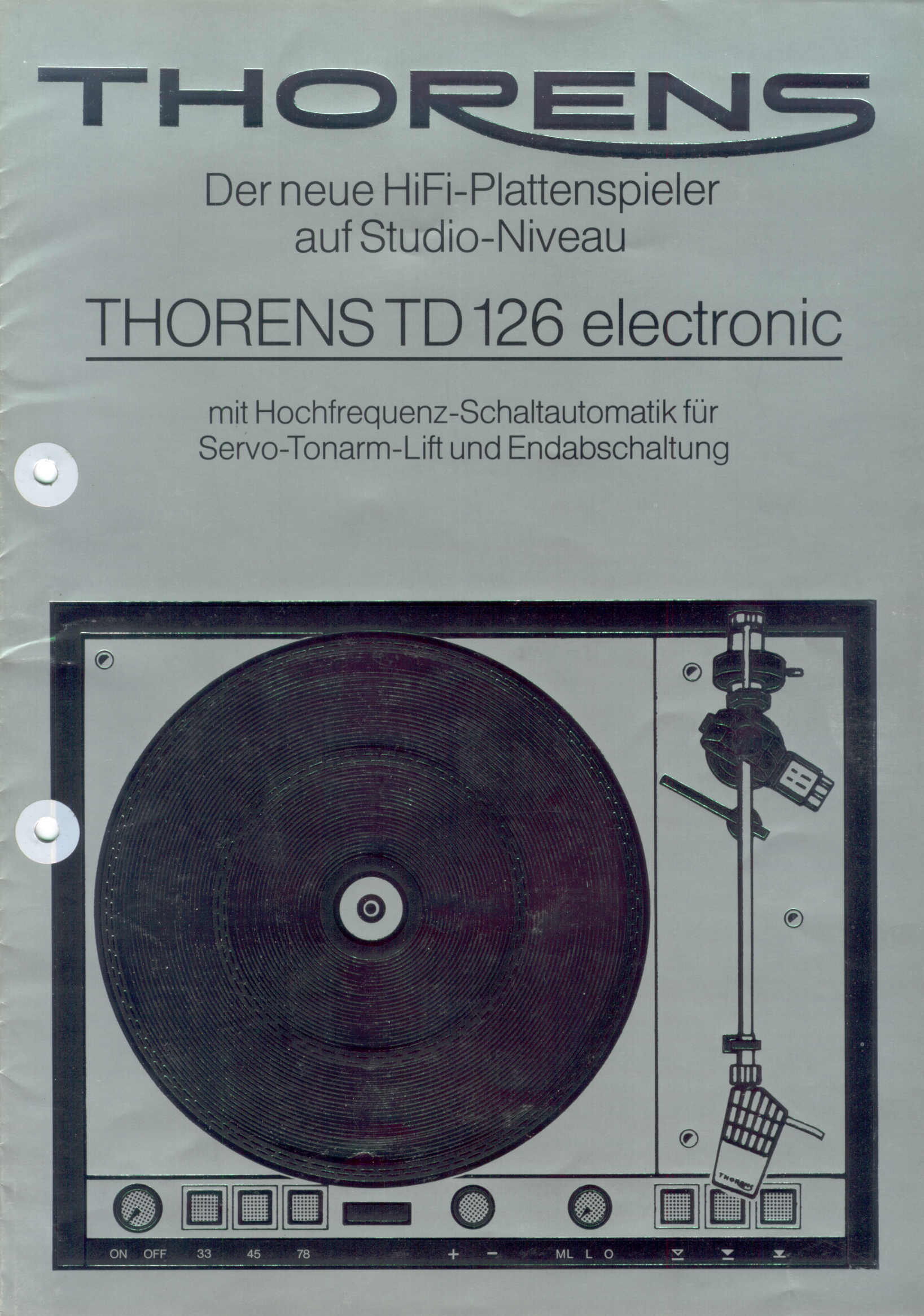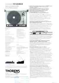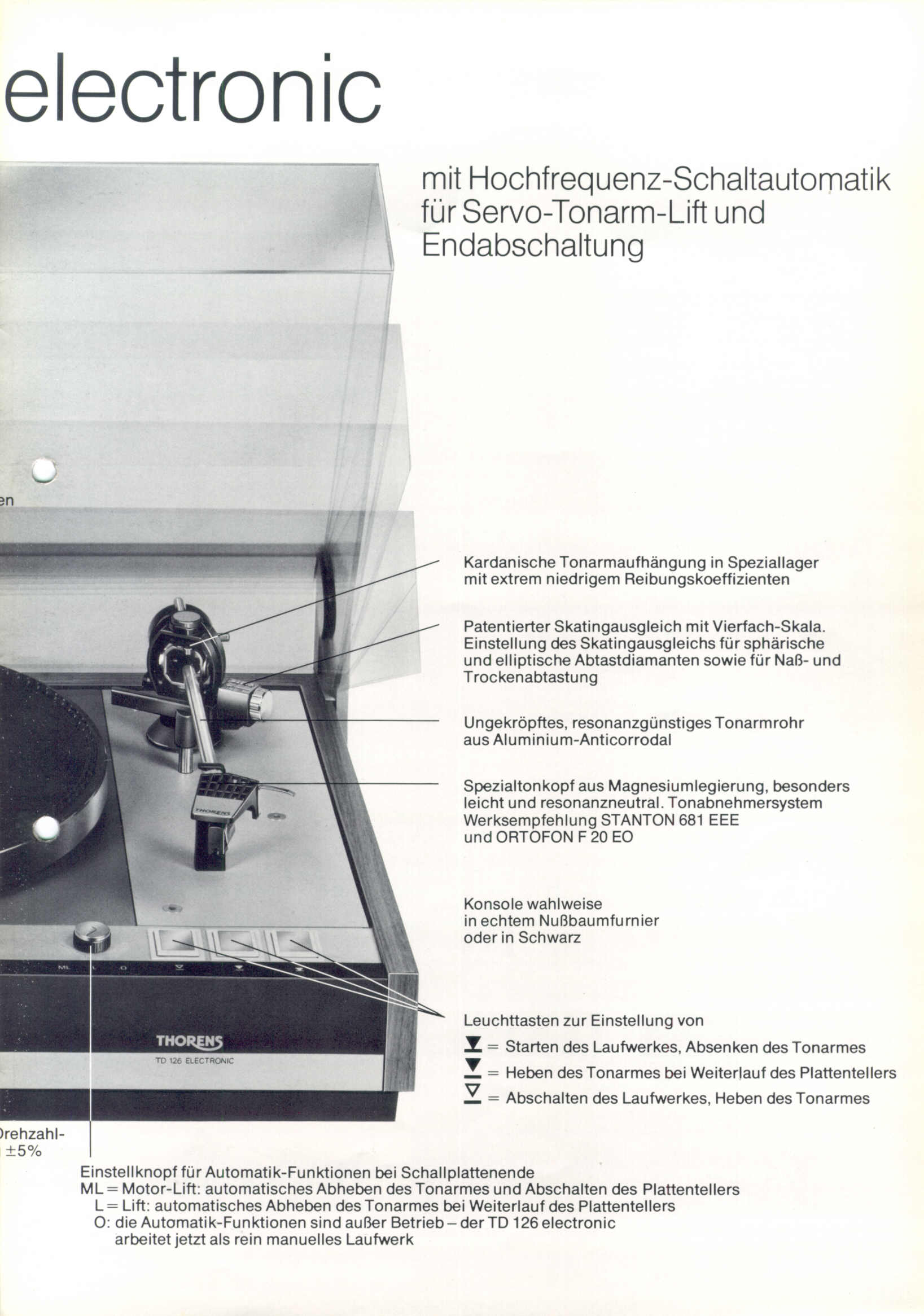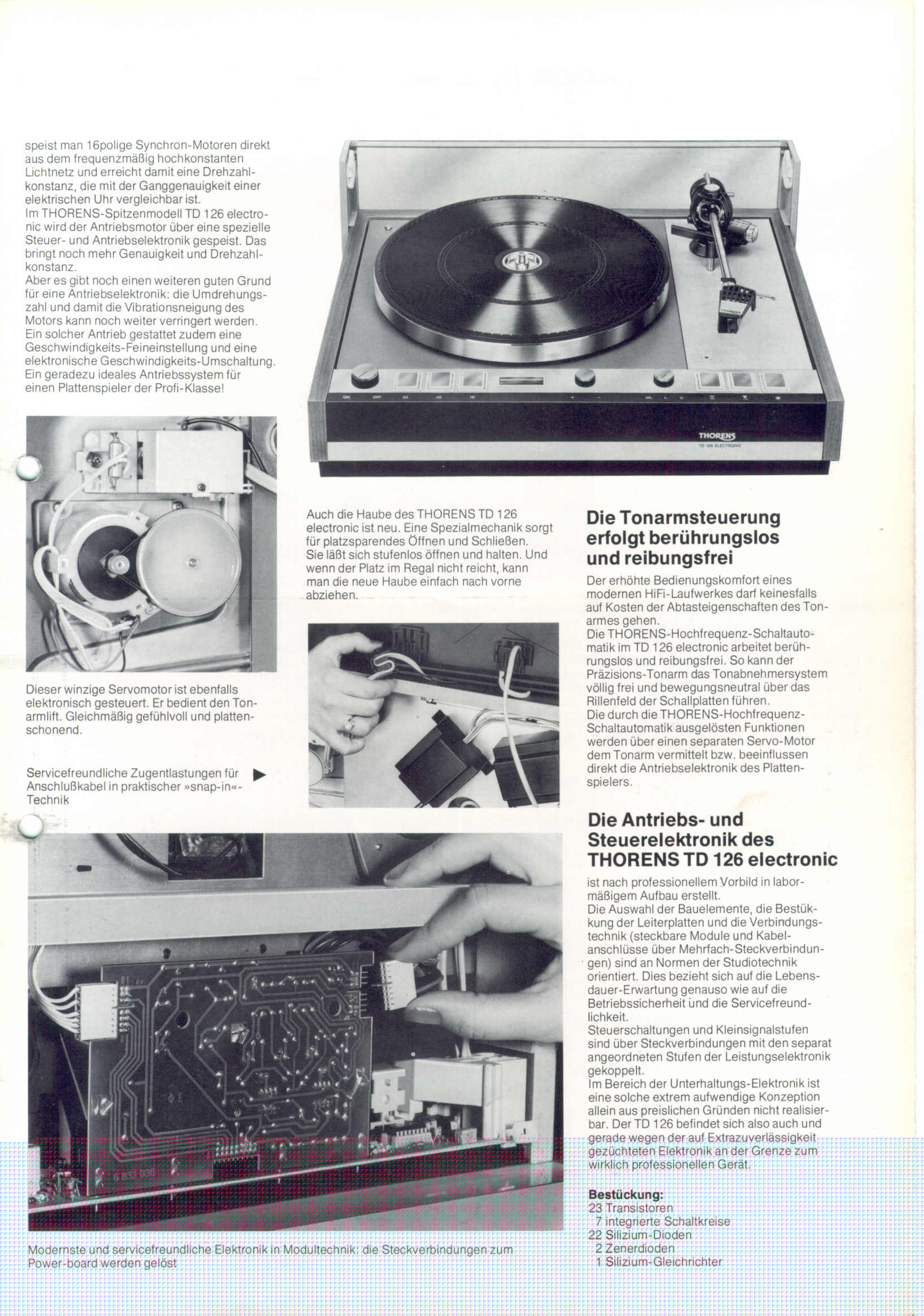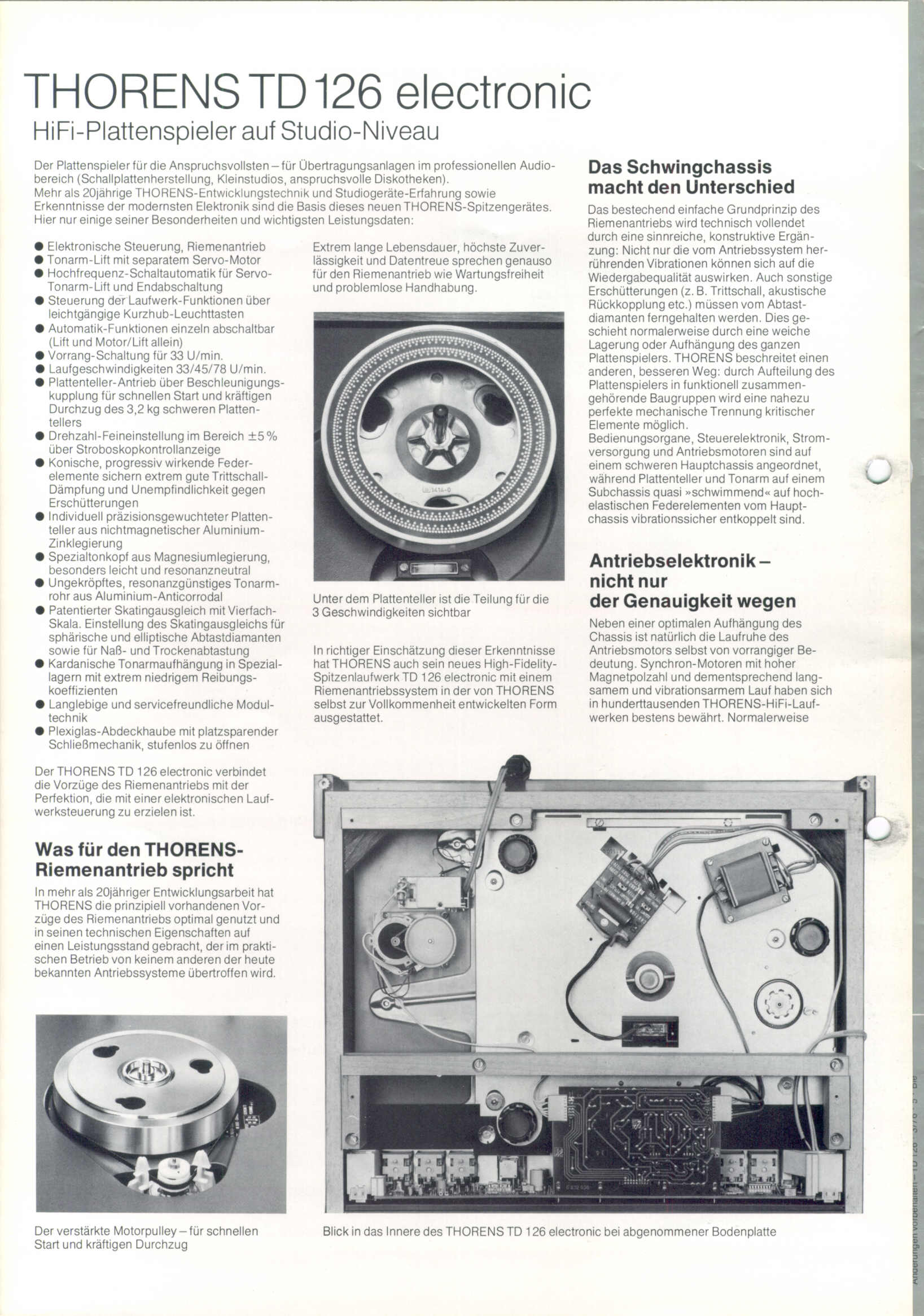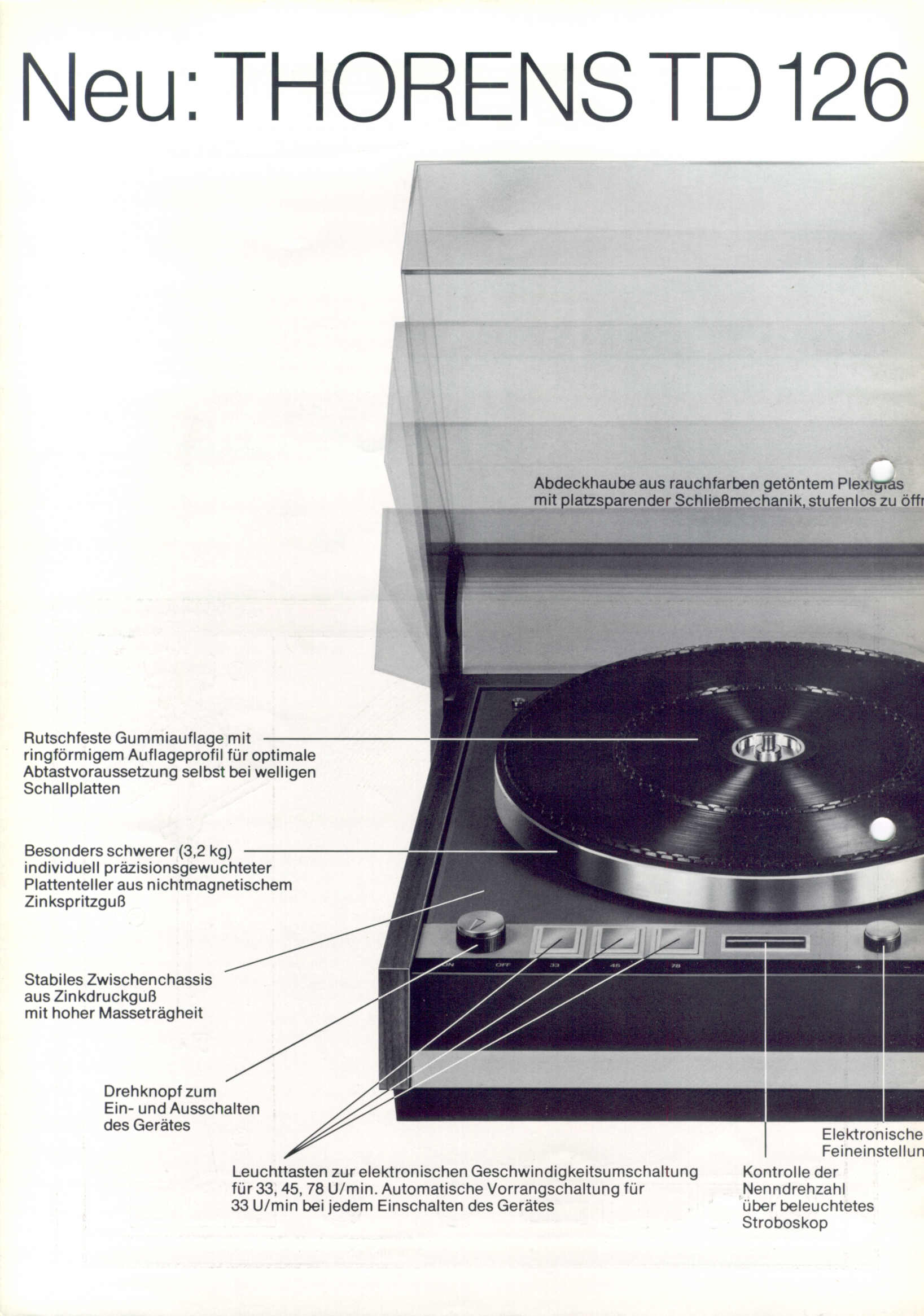 Unter Schallplattenliebhabern gilt der Thorens TD 126 seit 1976 als Inbegriff eines hochwertigen Plattenspielers. Als Nachfolger des TD 125 konzipiert, wurden dessen bewährte Konstruktionsmerkmale, wie z.B. das an drei Kegelfedern aufgehängte Subchassis und der elektronisch geregelte, einstufige Riemenantrieb, aufgegriffen und weiter verbessert. Die oft geäußerte Kritik am ungewöhnlichen Drehzahlangebot des 125er (16, 33 und 45 U/min) zeigte Wirkung: Thorens verzichtete zugunsten der für Schellackplatten wichtigen 78 Umdrehungen auf die nur selten benötigte 16er Drehzahl. Neu war der hohe Bedienungskomfort mit elektrischem Tonarmlift und vorwählbarer Betriebsart (Endabschaltung mit und ohne Motorstopp, voll manuell). Motor TD 126 u. TD 126 Mk. II : AC; 16-poliger Synchronmotor m. 2-Phasen-Generator, Regelung über Netzfrequenz. Geschwindigkeiten 33, 45 und 78 U/min., elektron. Umschaltung, pitchbar +/- 6%. Der TD 126 Mk III, der bereits ein Jahr später auf den Markt kam, prägte anschließend entscheidend den Ruf dieses hervorragenden Laufwerks. Anstelle des bewährten 16-poligen Synchronmotors verfügte der Mk III über einen komplett neu entwickelten Antrieb mit einem Gleichstrommotor und lastabhängiger Tachoregelung (DC, 72-poliger Tachogenerator, elektron. Komparatorschaltung, APC - automatic pitch control). Da diese Technik mit einem geschlossenen Regelkreis arbeitet, können durch Mitlaufbesen oder Zusatzgewichte verursachte Drehzahlfehler ausgeglichen werden. Neben dem serienmäßig montierten Tonarm TP 16 Mk III wurde der TD 126 Mk III später auch ab Werk mit Tonarmen von Dynavector, Koshin und SME bestückt. Selbst mit diesen Tonarmen bot das Laufwerk uneingeschränkten Bedienungskomfort (Ausnahme: Dynavector-Arm). Unter der Bezeichnung TD 126 Spezial wurde das Laufwerk mit dem Studiotonarm EMT 929 angeboten. Um den bewährten TD 126 Mk III für den professionellen Einsatz in Discotheken und kleineren Tonstudios nutzen zu können, entwickelte Thorens den Mk IV. Optisch nahezu unverändert, war das Laufwerk den Anforderungen entsprechend modifiziert worden. Der tachogeregelte Gleichstromantrieb wurde durch einen elektronisch geregelten Wechselstromantrieb ersetzt, der schon bei der ersten Generation des TD 126 zum Einsatz kam. Weitere Änderungen betrafen die straffere Anlaufkupplung für eine kürzere Hochlaufzeit und das härter aufgehängte Subchassis.