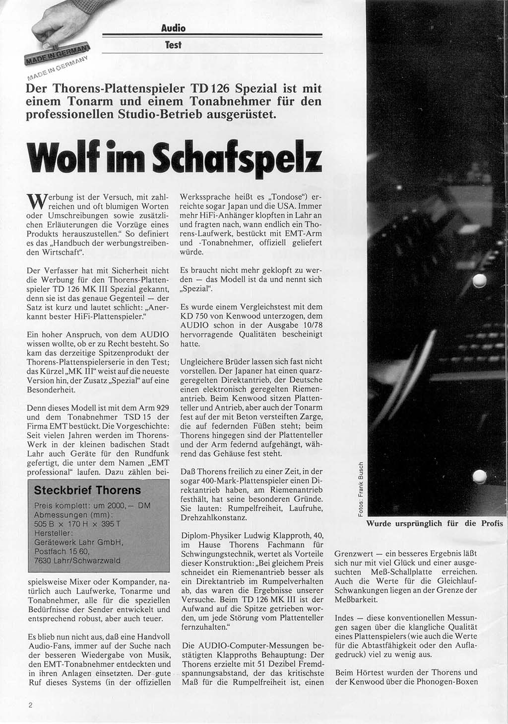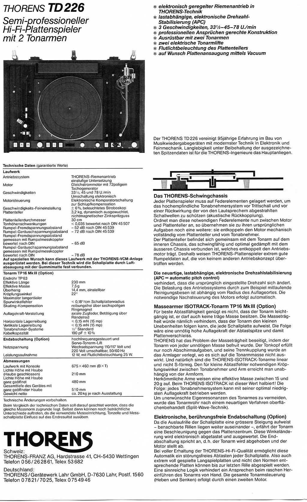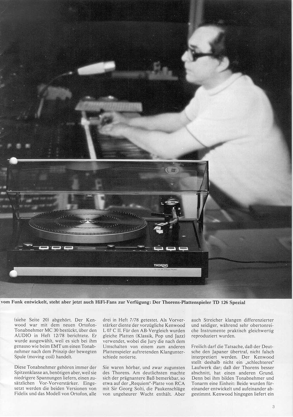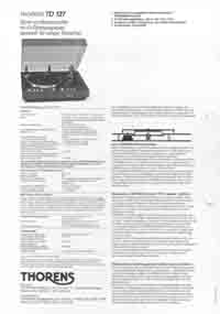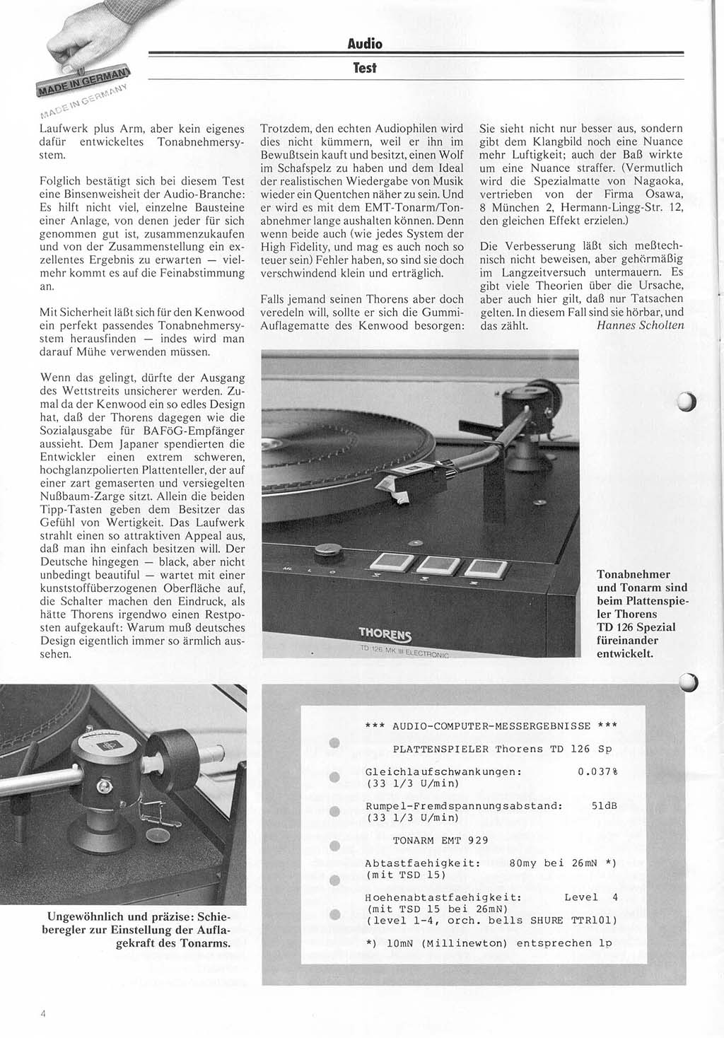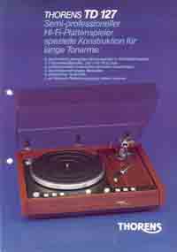 Unter Schallplattenliebhabern gilt der Thorens TD 126 seit 1976 als Inbegriff eines hochwertigen Plattenspielers. Als Nachfolger des TD 125 konzipiert, wurden dessen bewährte Konstruktionsmerkmale, wie z.B. das an drei Kegelfedern aufgehängte Subchassis und der elektronisch geregelte, einstufige Riemenantrieb, aufgegriffen und weiter verbessert. Die oft geäußerte Kritik am ungewöhnlichen Drehzahlangebot des 125er (16, 33 und 45 U/min) zeigte Wirkung: Thorens verzichtete zugunsten der für Schellackplatten wichtigen 78 Umdrehungen auf die nur selten benötigte 16er Drehzahl. Neu war der hohe Bedienungskomfort mit elektrischem Tonarmlift und vorwählbarer Betriebsart (Endabschaltung mit und ohne Motorstopp, voll manuell). Motor TD 126 u. TD 126 Mk. II : AC; 16-poliger Synchronmotor m. 2-Phasen-Generator, Regelung über Netzfrequenz. Geschwindigkeiten 33, 45 und 78 U/min., elektron. Umschaltung, pitchbar +/- 6%. Der TD 126 Mk III, der bereits ein Jahr später auf den Markt kam, prägte anschließend entscheidend den Ruf dieses hervorragenden Laufwerks. Anstelle des bewährten 16-poligen Synchronmotors verfügte der Mk III über einen komplett neu entwickelten Antrieb mit einem Gleichstrommotor und lastabhängiger Tachoregelung (DC, 72-poliger Tachogenerator, elektron. Komparatorschaltung, APC - automatic pitch control). Da diese Technik mit einem geschlossenen Regelkreis arbeitet, können durch Mitlaufbesen oder Zusatzgewichte verursachte Drehzahlfehler ausgeglichen werden. Neben dem serienmäßig montierten Tonarm TP 16 Mk III wurde der TD 126 Mk III später auch ab Werk mit Tonarmen von Dynavector, Koshin und SME bestückt. Selbst mit diesen Tonarmen bot das Laufwerk uneingeschränkten Bedienungskomfort (Ausnahme: Dynavector-Arm). Unter der Bezeichnung TD 126 Spezial wurde das Laufwerk mit dem Studiotonarm EMT 929 angeboten. Um den bewährten TD 126 Mk III für den professionellen Einsatz in Discotheken und kleineren Tonstudios nutzen zu können, entwickelte Thorens den Mk IV. Optisch nahezu unverändert, war das Laufwerk den Anforderungen entsprechend modifiziert worden. Der tachogeregelte Gleichstromantrieb wurde durch einen elektronisch geregelten Wechselstromantrieb ersetzt, der schon bei der ersten Generation des TD 126 zum Einsatz kam. Weitere Änderungen betrafen die straffere Anlaufkupplung für eine kürzere Hochlaufzeit und das härter aufgehängte Subchassis.
