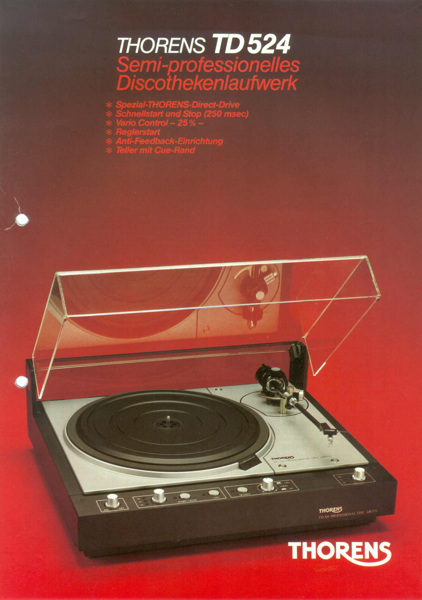 TD 738 Das manuelle Studiolaufwerk TD 738 repräsentierte - wie die komfortablere Version TD 524 - Anfang der 80er Jahre bei den professionellen Schallplatten-Wiedergabemaschinen den Stand des technisch Machbaren. Neben dem etwas eingeschränkteren Bedienungskomfort unterschied sich der 738er durch die massivere Zarge aus Buchenholz und den Tonarm TP 29 (auf der Basis des EMT-Studiotonarms 929) vom TD 524. Unter dem außenliegenden, aufwendig gelagerten Subchassis befand sich fast ausschließlich die Technik des EMT 938. Im Gegensatz zu den professionell ausgerichteten EMT-Laufwerken verzichtete Thorens jedoch auf die aufwendige modular aufgebaute Elektronik, mit der diese Geräte an die installierte Studiotechnik angepasst werden konnten. Auch der TD 738 hatte alle Eigenschaften, die man sich für den harten Einsatz in Studios nur wünschen konnte. Der Plattenteller erreichte in Sekundenbruchteilen die jeweilige Nenndrehzahl und kam auch ebenso schnell wieder zum Stillstand. Über Pitchregler und Leuchtstroboskop konnte die Drehzahl um jeweils 25% erhöht oder reduziert werden. Mit der Feineinstellung umfasste der Regelbereich noch ±6 %. Ein Knopfdruck genügte, um den Teller wieder quarzstabilisiert auf Nenndrehzahl zu bringen. Aus dem Studioeinsatz kommt auch die 15-polige Schnittstelle, die es ermöglicht, alle Laufwerksfunktionen über ein Mischpult oder externe Bedienelemente fernzusteuern ("Reglerstart").